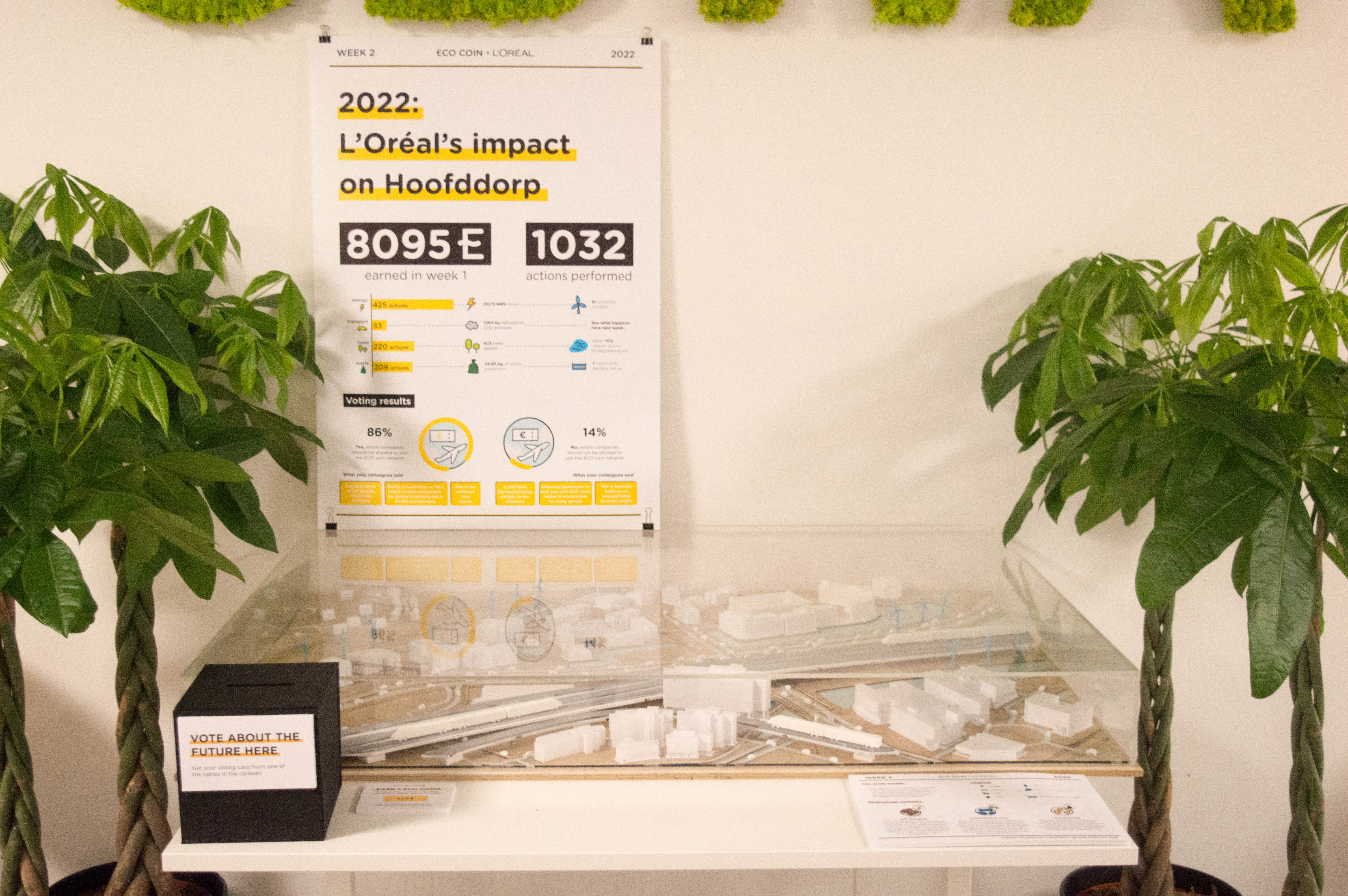 AtL’Oréal, we were invited to make 250 staff members more sustainable. During the one-month implementation of our sustainably currency, the vast majority of their employees fanatically earned ECO coins. Over 4000 actions were performed in total in just 20 days! One big scale model, which showed the neighbourhood around L’Oréal’s office (their ECO village) was present in the canteen and was updated once every week, based on the actions of all the employees together.The employees liked seeing the landscape change and improve, but we soon learned that they found it hard to distinguish the exact impact that their personal actions had.
