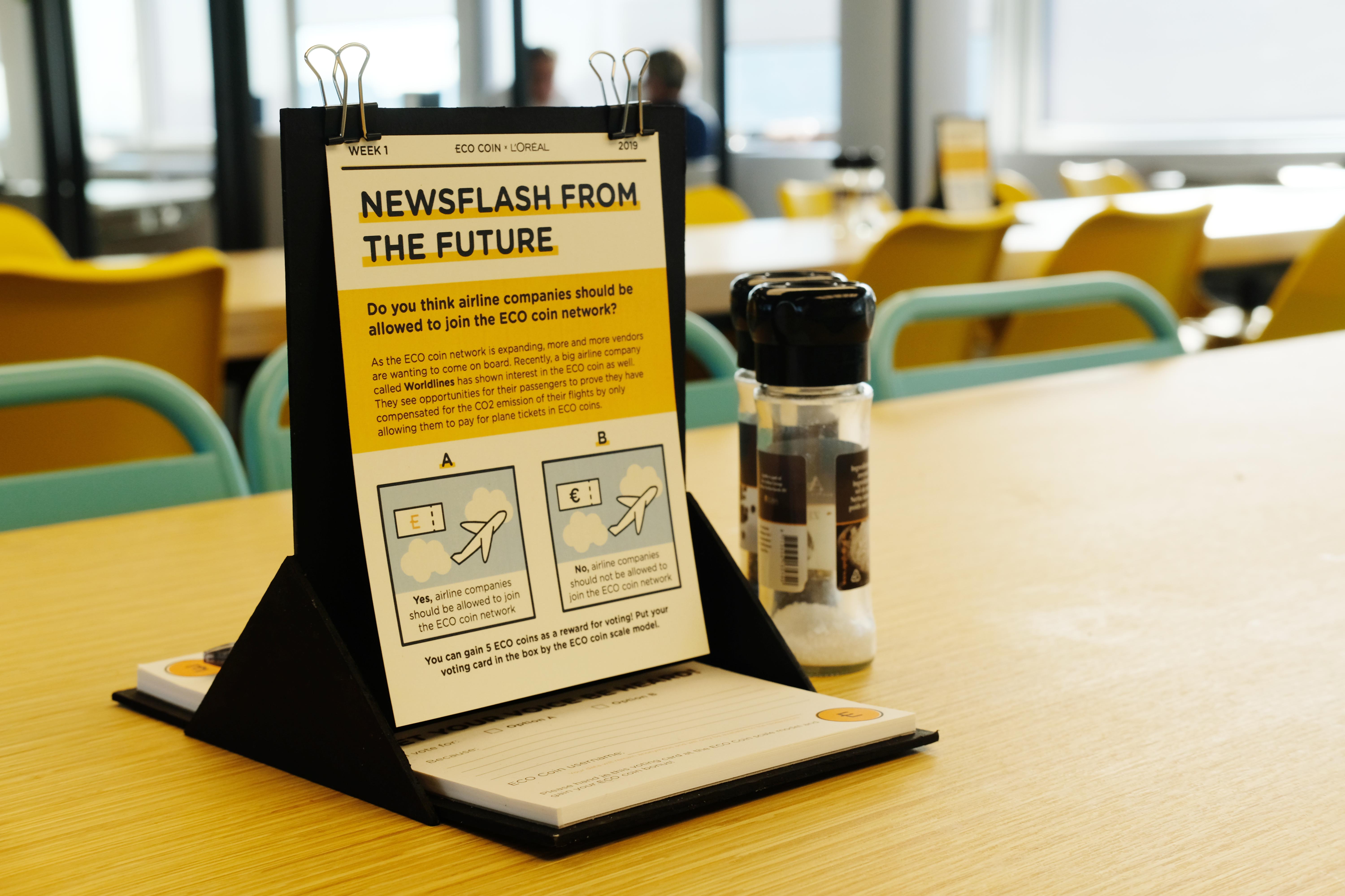 Over the past year, we have been experimenting with showing people what kind of future impact they could have when they perform actions with the ECO coin. We did this in two places, at the headquarters of L’Oréal Netherlands and at the TU/e(Eindhoven University of Technology) campus in the department of Industrial Design.Here we crafted the ECO village, a fictional community that grows as participants perform actions incentivised by the ECO coin. Different future  technologies were introduced over time to make users aware of the future scenario.
